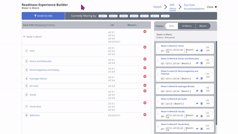 3. Click "Add Items" in the breadcrumb path. We will automatically add any reading and question associated with the Learning Objectives (LOs) on the class days covered. If these are not added: