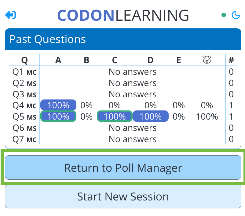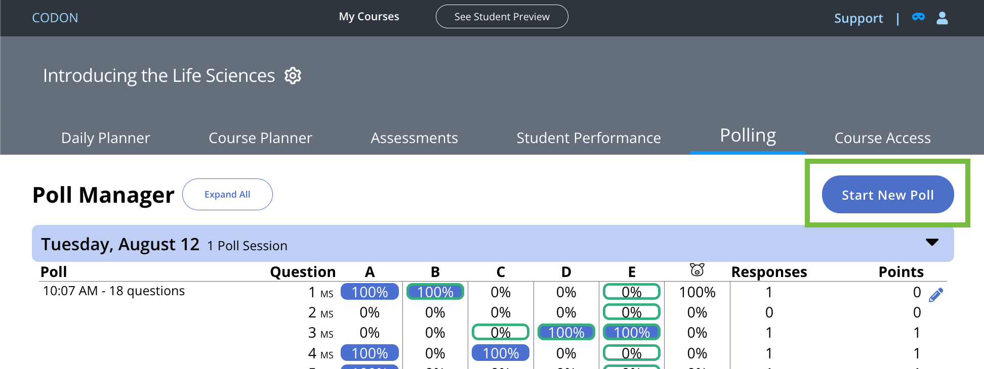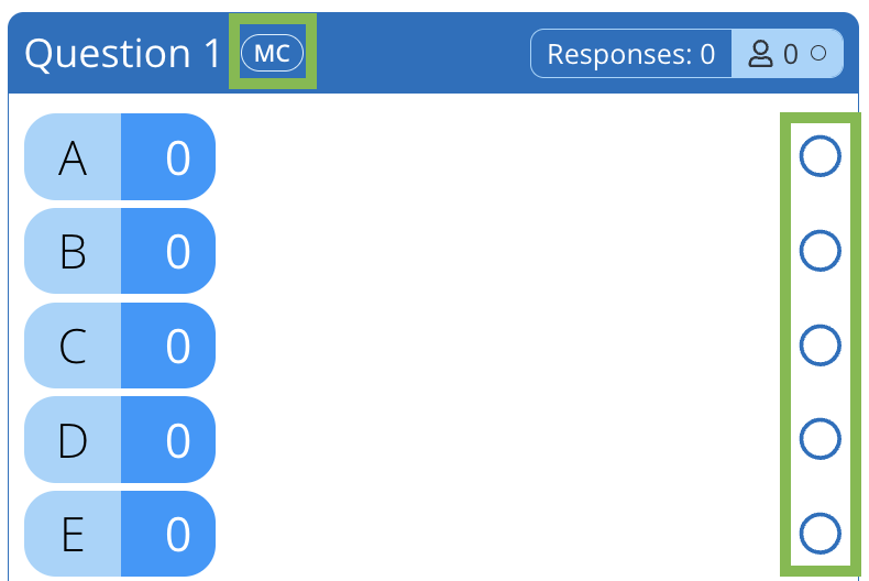 A note about setting correct answers: You can select the correct answer for a question at any time while it is open during the poll or later on from the Polling page. This does NOT affect grading. It will, however, add a green outline around those responses to make it easier to interpret response distribution summaries.