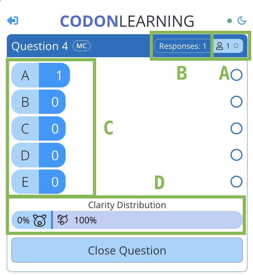 - As students join the poll, the number next to the person avatar (A) will increase. As students answer, the number next to “Responses:” (B) will increase. The response distribution (C) and muddy/clear split (D) will update in real time.