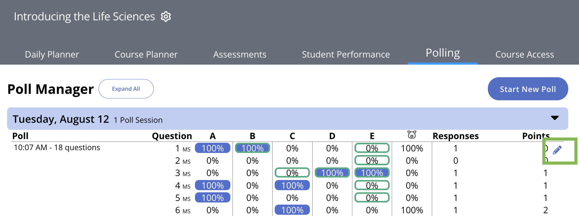 - The Polling page is where you can view response distributions from past polls and change points possible for polling questions.