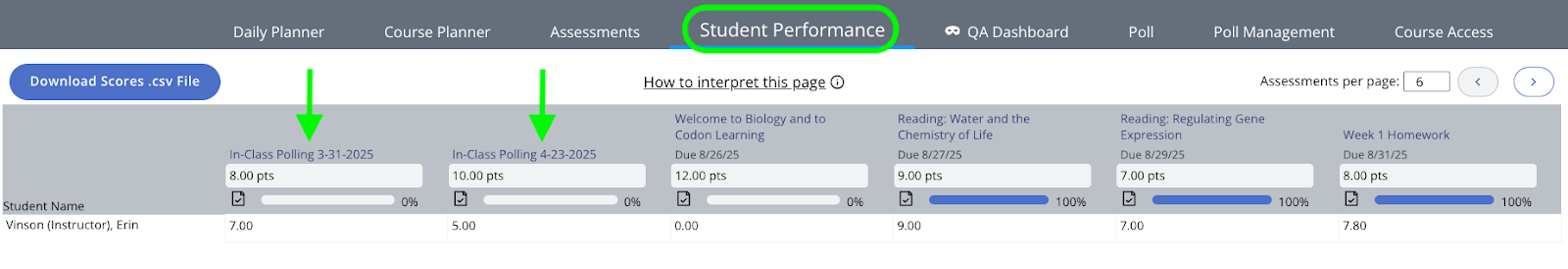 - To view points that individual students have earned from polling sessions, go to Student Performance. Click on the column header for the desired polling session to see more details about students scores and responses on individual questions.