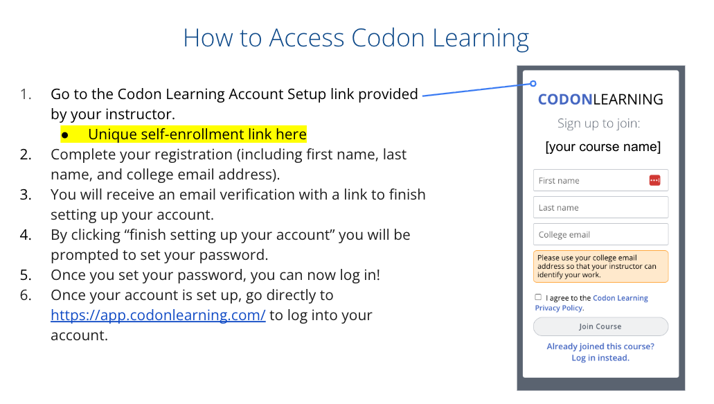 - Students will go to the unique Codon Learning Account Setup link provided by your ESS.